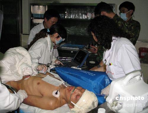 5月21日,四川省綿竹縣被埋8天8夜零4小時(shí)(196個(gè)小時(shí))的天池煤礦礦工賴元平被救出,經(jīng)解放軍255醫(yī)院醫(yī)療隊(duì)急救后由成都軍區(qū)直升飛機(jī)接至成都軍區(qū)總醫(yī)院救治。傷者在該院作CT檢查時(shí)被發(fā)現(xiàn)腦有內(nèi)巨大血腫,時(shí)刻有生命危險(xiǎn),成都軍區(qū)總醫(yī)院顧建文副院長(zhǎng)和解放軍301總醫(yī)院周定標(biāo)教授研究后決定立即手術(shù)。手術(shù)由顧建文副院長(zhǎng)主刀,1小時(shí)40分鐘后手術(shù)完成,術(shù)后傷員生命體癥平穩(wěn)。中新社發(fā) 朱琥姚遠(yuǎn) 攝