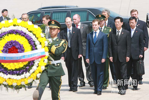俄羅斯總統(tǒng)梅德韋杰夫向人民英雄紀(jì)念碑敬獻(xiàn)花圈