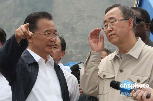 溫家寶與聯(lián)合國(guó)秘書(shū)長(zhǎng)潘基文在映秀會(huì)面