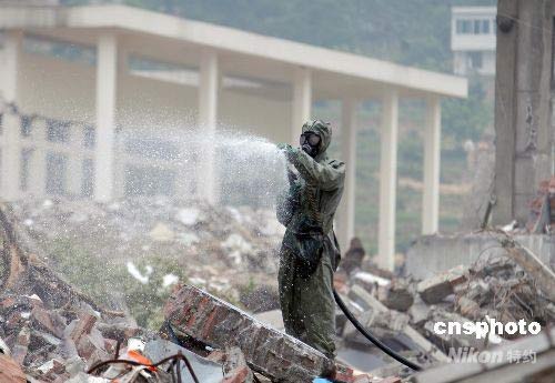 5月24日,防化兵對北川中學教學樓廢墟上灑消毒干粉后,再噴消毒藥水進行全面防疫。40多組機動消毒組分別對撤離后的北川空營區(qū)反復進行消毒,同時,7部噴灑車從四周對北川中學進行消毒水噴灑。經(jīng)過10多天的反復搜救,在北川縣城和北川中學廢墟下,已無法再找到生還者,于是指揮部決定從搜救階段轉到全面防疫階段。撤離搜救人員,對北川縣城實行交通管制,指揮部派直升飛機和專業(yè)防化部隊對災區(qū)進行全面防疫消毒。目前,已在災區(qū)開展飲食、飲水、環(huán)境消毒、殺蟲等工作,確保大災之后無大疫。中新社發(fā) 成和平 攝