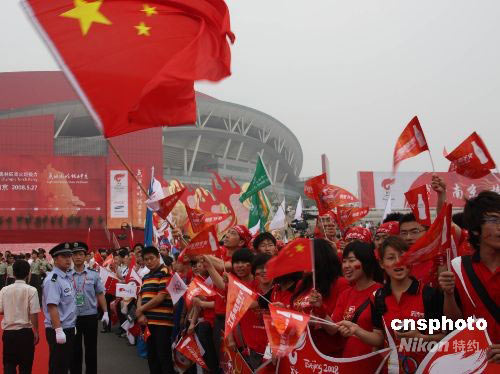 圖為起跑儀式開始前,南京的群眾夾道高呼“奧運(yùn)加油”。