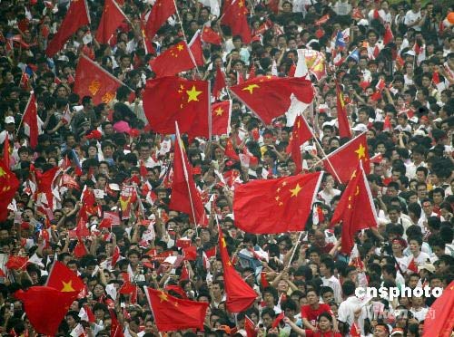 圖:熱情群眾揮舞國(guó)旗歡迎祥云火炬