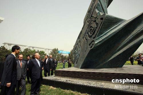 5月28日,中國(guó)國(guó)民黨主席吳伯雄一行前往北京奧林匹克中心區(qū),參觀臺(tái)灣藝術(shù)家楊英風(fēng)的雕塑作品“水袖”。中新社發(fā) 盛佳鵬 攝