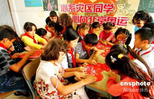 5月29日上午,浙江義烏群星學(xué)校舉行“心系災(zāi)區(qū)學(xué)生 心向北京奧運(yùn)” 慶“六一” 活動。全校2300多名學(xué)生與147名外籍學(xué)生,在各自的心愿卡上寫下祝福話語,祝愿四川地震災(zāi)區(qū)小朋友“六一”快樂,祝愿北京奧運(yùn)會圓滿成功。中新社發(fā) 張建成 攝