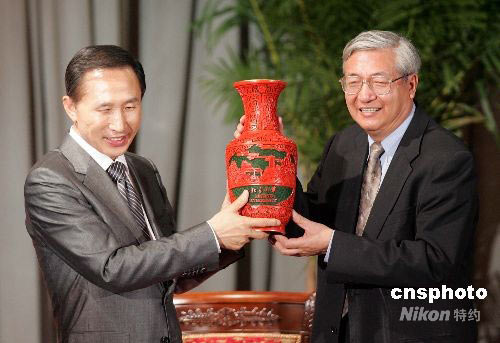 圖為北京大學(xué)校長(zhǎng)許智宏(右)向李明博贈(zèng)送禮物。中新社發(fā) 張宇 攝