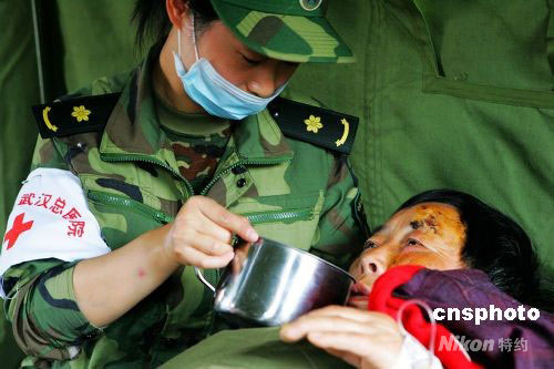 廣州軍區(qū)武漢總醫(yī)院護(hù)士彭葉葉,在汶川為從廢墟中救出來(lái)的劉華書老人喂藥。中新社發(fā) 徐維鴻 攝