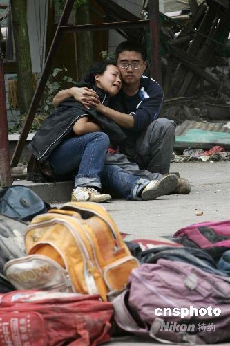 5月30日,四川什邡市紅白鎮(zhèn)中心小學(xué)的家長(zhǎng)在操場(chǎng)上認(rèn)領(lǐng)遇難孩子的書(shū)包,找到書(shū)包的父母在一旁傷心欲絕。5.12地震該校教學(xué)樓全部倒塌,大部分學(xué)生遇難。中新社發(fā) 杜洋 攝