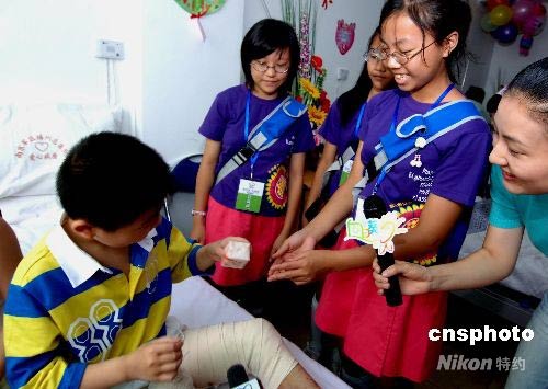 澎湖馬公小學(xué)音樂(lè)班的3位同學(xué)向在此接受治療的四川綿竹9歲的丁磊送上節(jié)日禮物和祝福。中新社發(fā) 劉可耕 攝