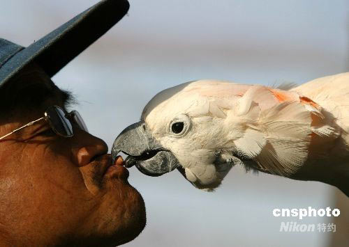 2008年6月1日,在山東西霞口神雕山野生動(dòng)物園百鳥(niǎo)園內(nèi),一只鸚鵡從一位老人嘴中搶食,這種人、鳥(niǎo)和睦共處有趣的絕技表演,吸引著眾多游客前來(lái)觀賞。中新社發(fā) 郭光耀 攝