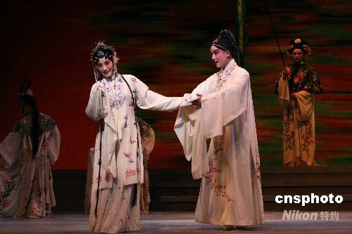 著名作家白先勇打造的青春版昆曲《牡丹亭》3日起將在倫敦的薩德勒斯韋爾斯劇院上演。圖為該劇2日彩排的劇照,右為俞玖林飾演的柳夢梅,左為沈豐英飾演的杜麗娘。中新社發(fā) 李鵬 攝