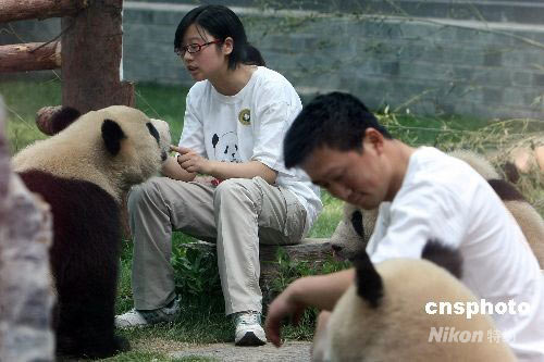 6月5日上午,八只臥龍“奧運(yùn)大熊貓寶寶”在北京動(dòng)物園的新家中首次公開(kāi)亮相。這些1歲多的“小國(guó)寶”不時(shí)需要臥龍來(lái)的飼養(yǎng)員用四川鄉(xiāng)音安撫它們?cè)?·12大地震中受到驚嚇的心靈。 中新社發(fā) 任晨鳴 攝