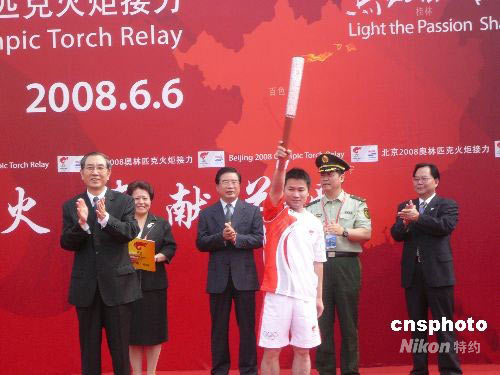 六月六日上午九時,廣西桂林市國際會展中心廣場,奧運圣火傳遞活動舉行了簡短而莊重的起跑儀式。全體人員向四川地震遇難同胞默哀一分鐘。九時十五分,前奧運會舉重冠軍唐靈生從廣西壯族自治區(qū)主席馬飚手中接過“祥云”火炬,開始了圣火在桂林市的傳遞。 中新社發(fā) 周利朔 攝