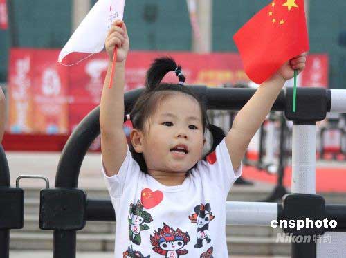 廣西南寧一位小朋友在民族廣場(chǎng)為即將到來的奧運(yùn)火炬歡呼。中新社發(fā) 劉萬強(qiáng) 攝