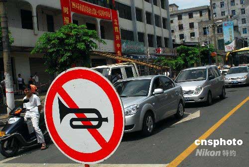 ?谝桓呖键c附近,交警部門設(shè)置的禁鳴喇叭標識牌。中新社發(fā) 善平 攝
