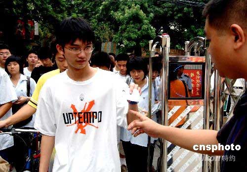 參加首日高考的福州考生步入福州銅盤中學考點時,主動出示準考證和身份證。中新社發(fā) 劉可耕 攝