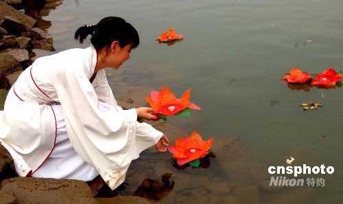 一名身著傳統漢服的福建青年女子向閩江放河燈,悼念在四川大地震中遇難的同胞。中新社發(fā) 劉可耕 攝