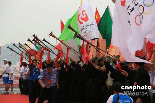 當?shù)噩幾迕癖姶淀應(yīng)毺氐默幾彘L號迎接奧運圣火。 中新社發(fā) 周兆軍 攝