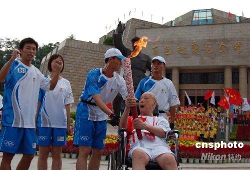 6月8日下午,奧運圣火在廣西百色市傳遞,當?shù)啬挲g最大的火炬手、九十二歲的老紅軍牟一琳坐在輪椅上,在百色起義紀念館前舉起了“祥云”火炬。百色是鄧小平軍事生涯的起點,一九二九年鄧小平在百色領(lǐng)導發(fā)動了著名的百色起義。中新社發(fā) 劉萬強 攝