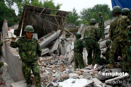 6月8日,中國空降兵某部“常勝模范連”所在團(tuán)官兵,進(jìn)村入戶之后,在四川省什邡市鎣華鎮(zhèn)幫助受災(zāi)群眾清理廢墟,搭建臨時過渡房。中新社發(fā) 譚超 攝