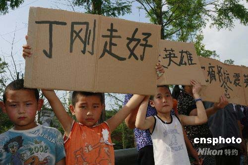 6月9日下午,四川省遂寧市數(shù)千群眾自發(fā)來到烈士陵園公墓,送別遂寧市優(yōu)秀的抗震救災(zāi)英雄丁剛。今年40歲的丁剛,是遂寧市船山區(qū)一名普通居民,6月3日參加遂寧市應(yīng)急民兵營一連突擊隊,赴災(zāi)區(qū)抗震救災(zāi)。5日18時30分許在映秀鎮(zhèn)搜尋失事直升飛機(jī)時,遇山體滑坡,為救戰(zhàn)友,被飛石擊中頭部,不幸犧牲。6月9日下午3點(diǎn)30分,遂寧市政府、遂寧軍分區(qū)為丁剛同志舉行遺體告別儀式,以告慰英靈。中新社發(fā) 鐘 敏 攝