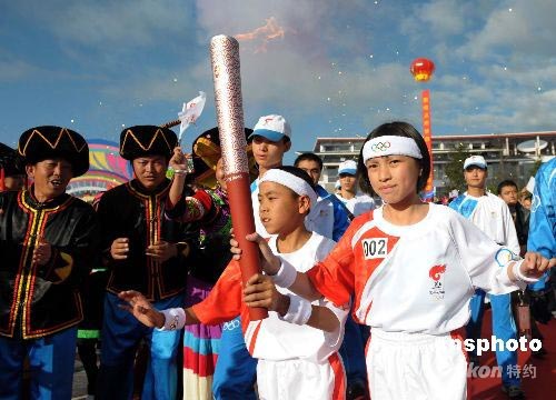 6月10日,奧運圣火在云南麗江開始傳遞,四川汶川地震孤兒張紫蘭(右)與云南麗江地震孤兒和震生共同傳遞首棒火炬。1996年,云南麗江曾發(fā)生7級地震。中新社發(fā) 廖攀 攝