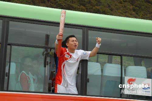 一位火炬手結(jié)束傳遞活動(dòng)前往結(jié)束儀式途中,手舉祥云火炬,高喊“中國(guó)加油”。中新社發(fā) 石雨 攝