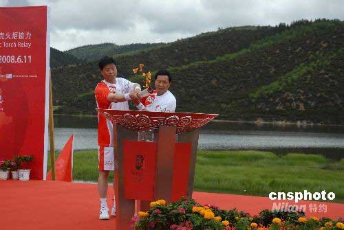 6月11日11時,奧運圣火香格里拉傳遞的最后一棒由香格里拉縣委書記彭耀文(左)和中國著名長跑運動員張國偉共同完成,祥云圣火在普達措國家公園完成香格里拉最后的傳遞線路。隨后兩名火炬手在屬都湖邊點燃圣火盆,奧運圣火傳遞香格里拉站圓滿結(jié)束。