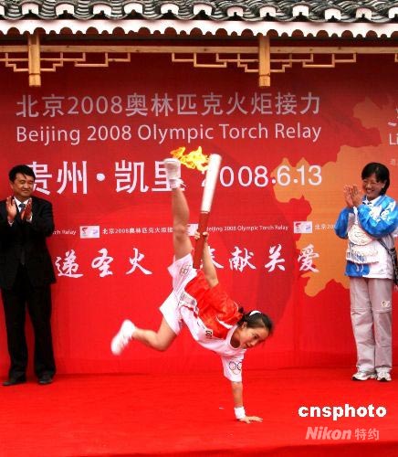 6月13日,奧運(yùn)火炬在貴州省黔東南苗族侗族自治洲傳遞,第一棒火炬手、體操運(yùn)動(dòng)員林麗接過火炬后,做起了精彩的體操動(dòng)作,引得現(xiàn)場(chǎng)一片喝彩。 中新社發(fā) 周兆軍 攝