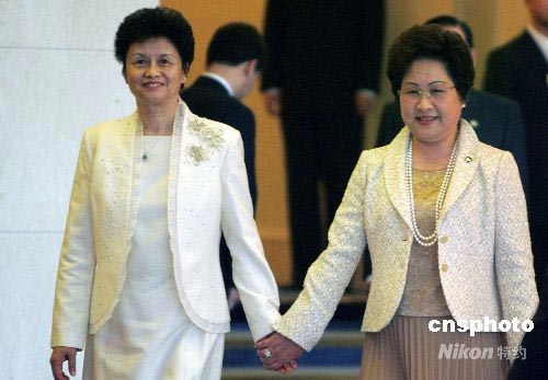 陳云林夫人(左)與江丙坤夫人攜手進(jìn)入簽字大廳。中新社發(fā) 任晨鳴 攝