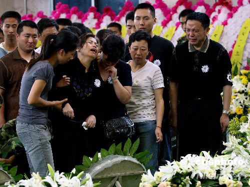 6月13日,四川大地震救援中失事直升機(jī)遇難機(jī)組人員遺體告別儀式在成都市殯儀館舉行,來自軍方及社會(huì)各界的人士紛紛前來送別英雄。圖為遇難機(jī)組人員家屬悲痛欲絕送別親人。中新社發(fā) 劉新 攝