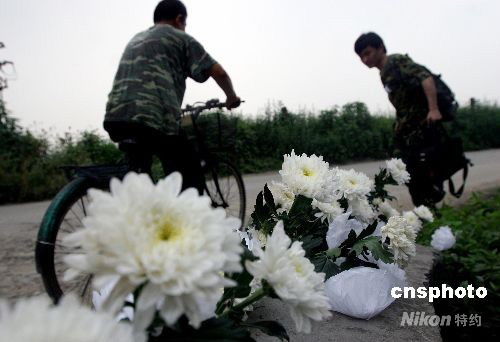 6月13日,在進入成都鳳凰山機場的道路上,附近民眾自發(fā)在路邊擺設(shè)白花,悼念失事直升機遇難機組人員。中新社發(fā) 劉新 攝