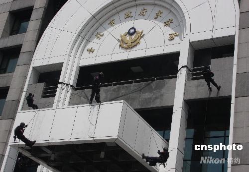 臺北市政府警察局十三日舉辦慶祝警察節(jié)活動,安排安排平日難得一見的特勤中隊(duì)表演戰(zhàn)技操演,隊(duì)員們?nèi)蔽溲b直接從警察局十三樓樓頂一路攀降而下,這也是臺北市警局大樓首次出現(xiàn)的高樓特警攀降表演。中新社發(fā) 耿軍 攝