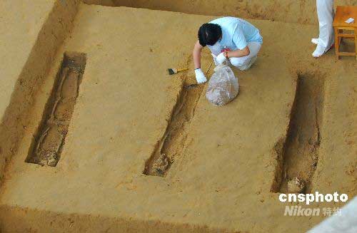 考古人員在提取殉葬人骨架。中新社發(fā) 從啟 攝