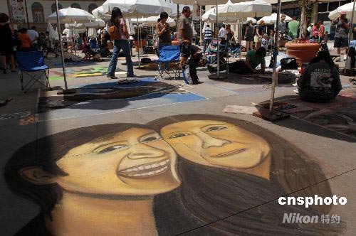 當(dāng)?shù)貢r(shí)間六月十五日,第十六屆帕薩迪納粉筆畫藝術(shù)節(jié)在加州帕薩迪納市街頭舉行。這個(gè)號(hào)稱“世界上規(guī)模最大”的街頭繪畫藝術(shù)節(jié),吸引約六百名繪畫藝術(shù)家和愛(ài)好者,消耗約兩萬(wàn)五千支彩色粉筆,數(shù)百幅作品占據(jù)兩個(gè)街區(qū)的人行道。中新社發(fā) 張煒 攝