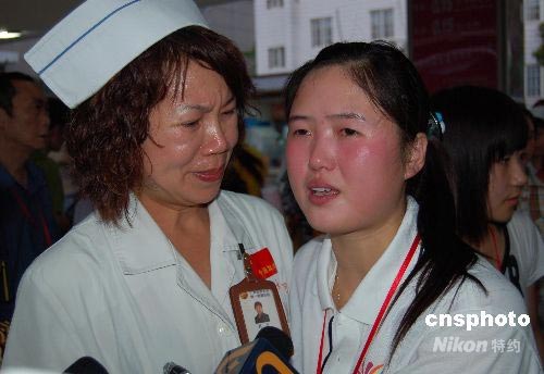 來自四川綿陽的傷員劉小紅與照顧她的一名護(hù)士灑淚分別。中新社發(fā) 劉萬強(qiáng) 攝