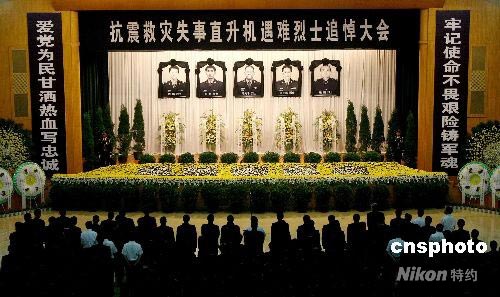 6月16日,在四川汶川大地震中執(zhí)行救援任務(wù)失事直升機組遇難烈士追悼大會在成都舉行,中共中央總書記、國家主席、中央軍委主席胡錦濤,中央軍委、總參謀部、總政治部等分別向邱光華、李月、王懷遠、陳林、張鵬五位烈士敬獻花圈。四川省黨、政、軍等社會各界前來吊唁。