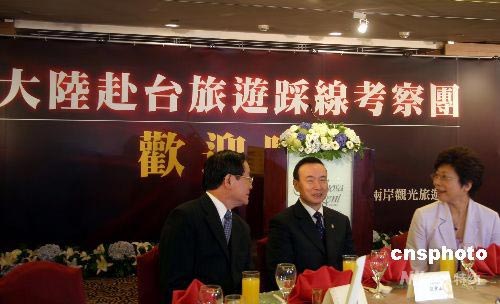 臺灣海峽兩岸觀光旅游協(xié)會會長賴瑟珍(右一)、該會董事張學勞(左一),與遠道而來的大陸海峽兩岸旅游交流協(xié)會副秘書長范貴山(中)溝通。中新社發(fā) 許曉青 攝
