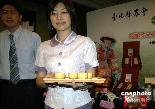 在臺北晶華酒店晚宴現(xiàn)場,臺灣旅游業(yè)者設(shè)展臺,沏特色文山包種茶,迎接大陸“踩線團(tuán)”。中新社發(fā) 許曉青 攝