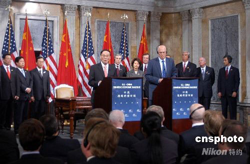 當(dāng)?shù)貢r間6月18日下午,剛剛結(jié)束中美第四次戰(zhàn)略經(jīng)濟對話的中國副總理王岐山和美國財政部長保爾森,在華盛頓共同會見記者。隨后雙方簽署《中美能源環(huán)境十年合作框架》文件。中新社發(fā) 管黎明 攝