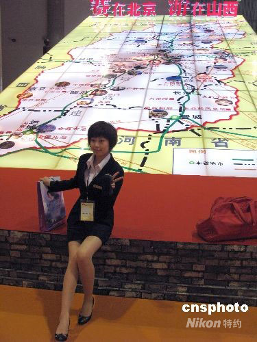 6月19日,以“體驗北京,感受奧運”為主題的“2008北京國際旅游博覽會”在北京展覽館開幕。此次博覽會參展商突破700家。圖為山西展團展臺打出“賽在北京,游在山西”口號,以醒目的旅游特色地圖吸引游客。中新社發(fā) 鄒憲 攝
