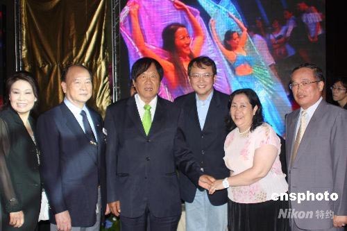 臺灣“立委”周守訓(xùn)(右三)前來向《明報》企業(yè)集團董事主席張曉卿(左三)表示祝賀。中新社發(fā) 耿軍 攝