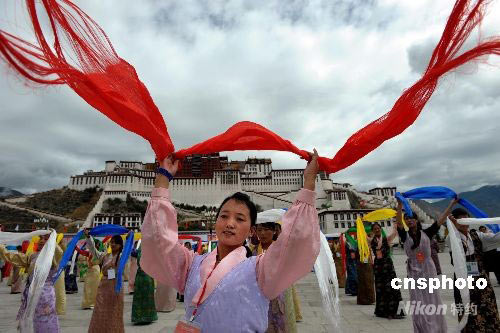 6月21日,奧運(yùn)火炬在西藏拉薩進(jìn)行傳遞。在布達(dá)拉宮廣場(chǎng)舉行的奧運(yùn)史上首次熔火儀式現(xiàn)場(chǎng),能歌善舞的藏族少女揮舞哈達(dá)迎接奧運(yùn)火炬。中新社發(fā) 廖攀 攝