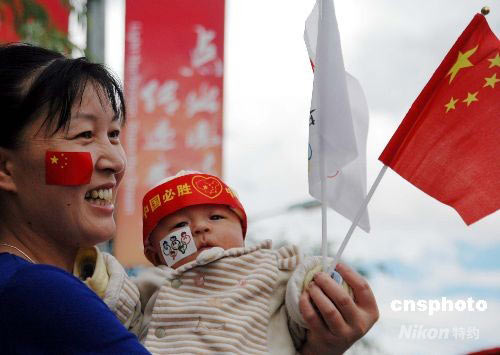 出生才60天的一名小寶寶周思璇同媽媽一道在街頭喜迎奧運火炬到達高原圣城。 中新社發(fā) 周波 攝