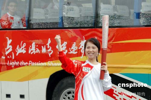 6月21日,奧運火炬在西藏拉薩進行傳遞,火炬手秦莉手持火炬興奮異常。中新社發(fā) 周波 攝