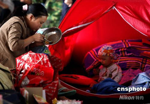 一位年輕母親正和在地鋪小帳篷里的愛子同吃午餐。中新社發(fā) 賈國(guó)榮 攝