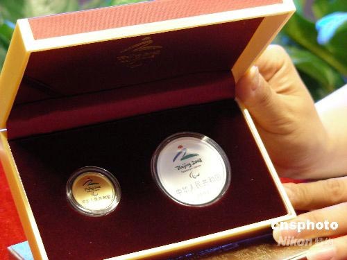 6月23日,中國人民銀行公開發(fā)行北京2008年殘奧會金銀紀念幣一套,其中三分之一盎司金幣和一盎司銀幣各一枚。該套紀念幣正面圖案均為北京2008年殘奧會會徽(彩色),并刊國名、年號。金質幣直徑23毫米,面額150元人民幣,最大發(fā)行量15000枚。銀質幣直徑40毫米,面額10元人民幣,最大發(fā)行量30000枚。從即日起,該套紀念幣將通過中國金幣總公司各網(wǎng)點機構向公眾銷售。中新社發(fā) 沈嘉 攝
