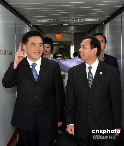 圖為郝龍斌(左)與上海市臺(tái)辦主任楊建榮(右)在機(jī)場(chǎng)談笑甚歡。中新社發(fā) 潘索菲 攝