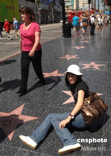 圖:中國(guó)游客在好萊塢星光大道上拍照留念