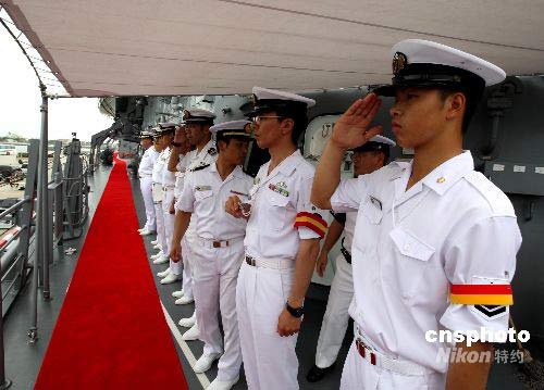 6月24日15時(shí)30分,日本海上自衛(wèi)隊(duì)“漣”號(hào)驅(qū)逐艦抵達(dá)中國(guó)湛江港碼頭。這是日本自衛(wèi)隊(duì)艦艇首次訪華,隨艦搭載向四川災(zāi)區(qū)提供的救援物資。日本海上自衛(wèi)隊(duì)第四護(hù)衛(wèi)隊(duì)群司令德丸伸一少將任指揮官,隨訪官兵240人。中國(guó)人民解放軍海軍官兵在湛江碼頭舉行儀式歡迎日本“漣”號(hào)艦艇訪華。圖為日艦艇官兵向歡迎儀式上的中國(guó)人民解放軍海軍官兵行禮。中新社發(fā) 宋吉河 攝