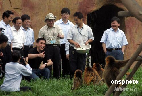6月25日上午,臺(tái)北市長(zhǎng)郝龍斌一行到上海野生動(dòng)物園,看望大熊貓和金絲猴。郝龍斌希望上海的大熊貓和金絲猴能落戶臺(tái)北,此外臺(tái)北的紅毛猩猩、白毛長(zhǎng)臂猿能來(lái)到上海。并題詞:關(guān)心生態(tài)愛(ài)護(hù)野生動(dòng)物是進(jìn)步城市的重要指標(biāo)。中新社發(fā) 潘索菲 攝